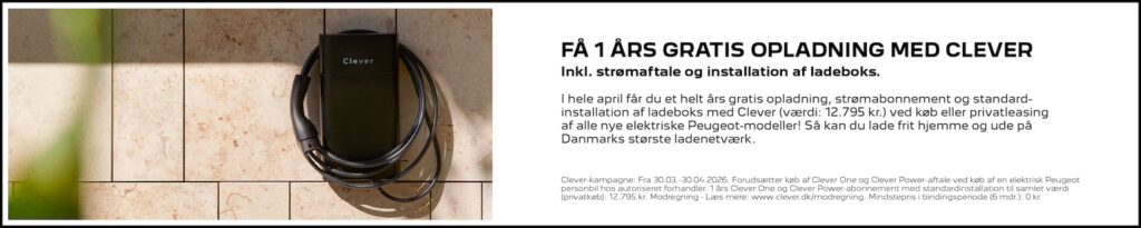 INKL. 1 ÅRS GRATIS OPLADNING MED CLEVER er det let og enkelt at oplade den nye Peugeot e-208 og få glæde af de helt op til 340 km (WLTP) elektrisk kørsel. Inkluderet i bilens pris er en standardinstallation til en Clever ladeboks, så du med et Clever Unlimited-abonnement kan oplade hjemmefra. Samtidig giver abonnementet dig adgang til de mange offentlige Clever-ladestandere, som findes over hele landet.