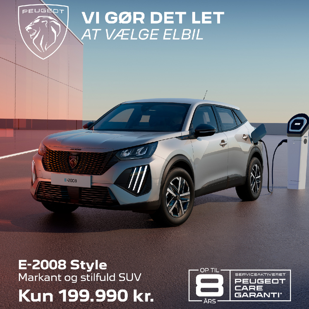 Forbrug: 15,9 kWh/100 km. Rækkevidde: 331 km. Halvårlig grøn ejerafgift 460 kr. Ladetid: v/max-effekt 11 kW 0-100% ned til 4 t. 40 min. v/max-effekt 100 kW 20-80% ned til 30 min. Den viste bil er en E-2008 GT til 229.990 kr. Prisen gælder så længe lager haves.