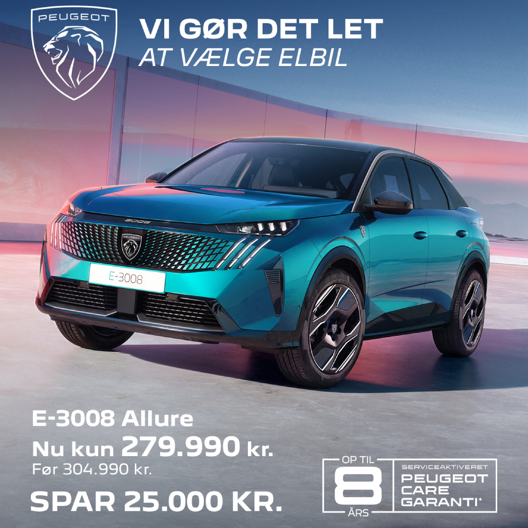 Forbrug: 16,8 kWh/100 km. Rækkevidde: 525 km. Halvårlig grøn ejerafgift 460 kr. Ladetid: v/max-effekt 11 kW 20-80% ned til 4 t. 50 min. v/max-effekt 160 kW 20-80% ned til 30 min. Den viste bil er en E-3008 GT til 299.990 kr. Tilbuddet er forlænget og gælder 29.12.2025-28.02.2026 eller så længe lager haves.