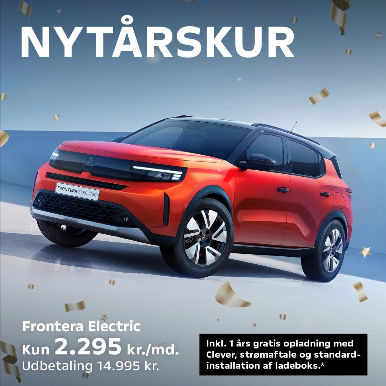 Forbrug: 17,6 kWh/100 km. Rækkevidde: 305 km. Ladetid: v/max-effekt 11 kW 20-80% ned til 2 t. 50 min. V/max-effekt 100 kW 20-80% ned til 26 min. Privatleasing v/Jyske Finans A/S. Mindstepris i bindingsperioden (12 mdr.): 43.315 kr. inkl. afleveringsgebyr 780 kr. Ekskl. ekstraudstyr, dækafgift, forsikring, brændstof og grøn ejerafgift. Kaskoforsikring, positiv kreditgodkendelse og betaling via Betalingsservice forudsættes. V/periodens udløb returneres bilen til Jyske Finans A/S. Aftalen kan opsiges m/varsel på 1 md. til udgangen af en måned, 11 mdr. efter indgåelse. Bilen er vist med ekstraudstyr. Tilbuddet gælder 29.12.2025-31.01.2026, så længe lager haves. *Clever-kampagne: 01.01-31.01.2026. Forudsætter køb af Clever One og Clever Power-aftale til Frontera Electric hos autoriseret forhandler. 1 års Clever One og Clever Power-abonnement med standardinstallation til samlet værdi (privatkøb): 12.795 kr. Modregning – læs mere: www.clever.dk/modregning. Mindstepris i bindingsperiode (6 mdr.): 0 kr. |