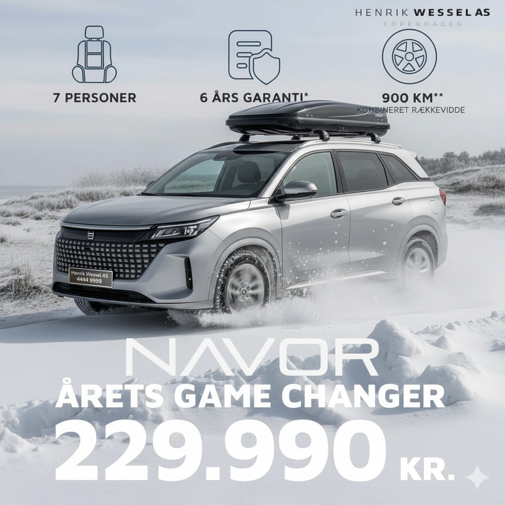 NAVOR E5 SUV 229.990 kr. NAVOR E5 er en stor bil, der er skabt til at opfylde alle dine kørselsbehov. SUV’en med en længde på 4,76 meter og plads til 7 personer kombinerer komfort, funktionalitet og masser af plads. 📞 Kontakt vores salgsafdeling for mere info og book prøvetur Ring 4444 9999 |