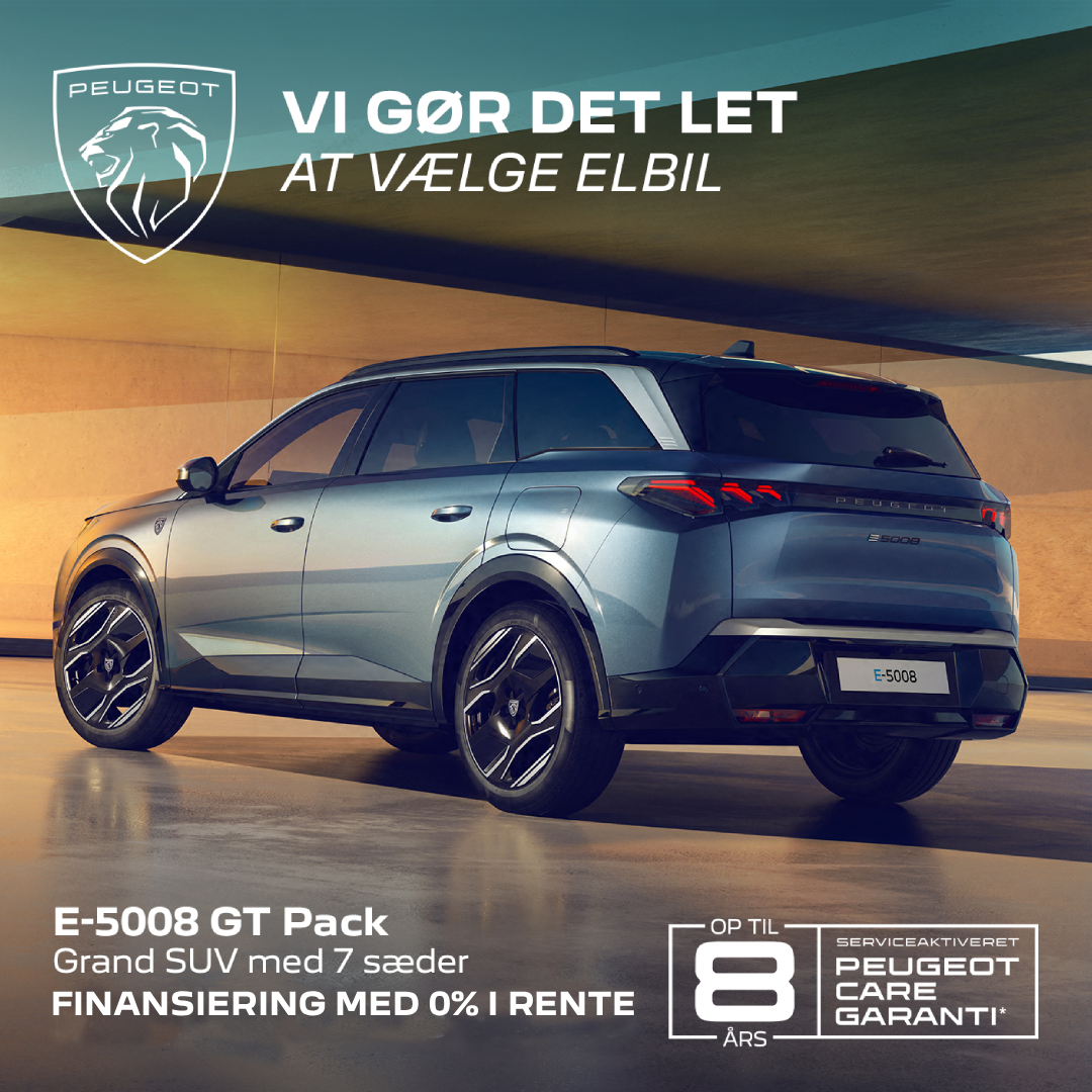 Den fuldendte elektriske SUV E-3008 er den perfekte familiebil. Den skiller sig ud med sit markante SUV-design samt next-level kvalitet og teknologi. Den kommer med en rækkevidde på 525 km og et udstyrsniveau, der overgår alle dine forventninger